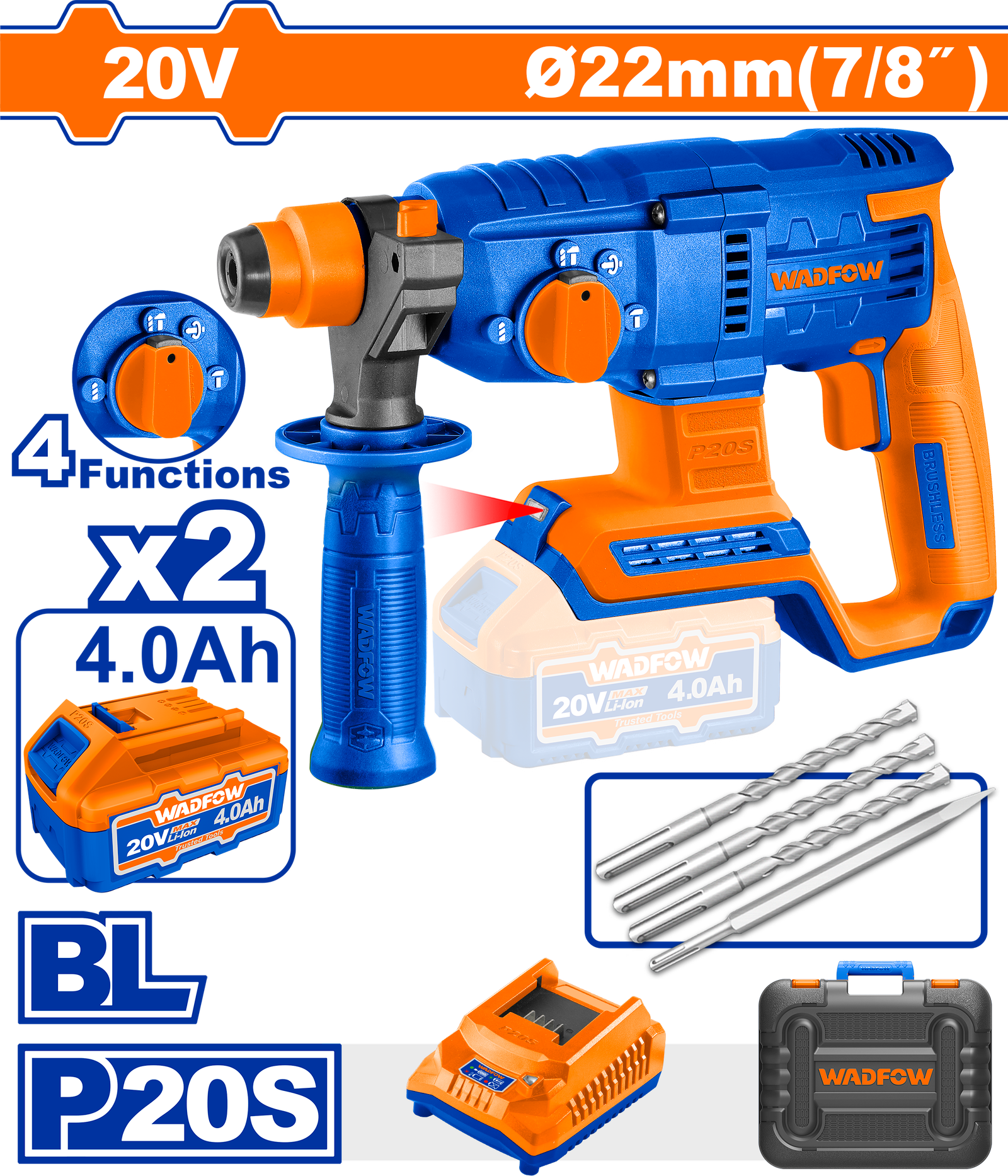 WLM15225 (Wadfow Cordless rotary hammer 20V 22mm + 2 Battery – P1C4)