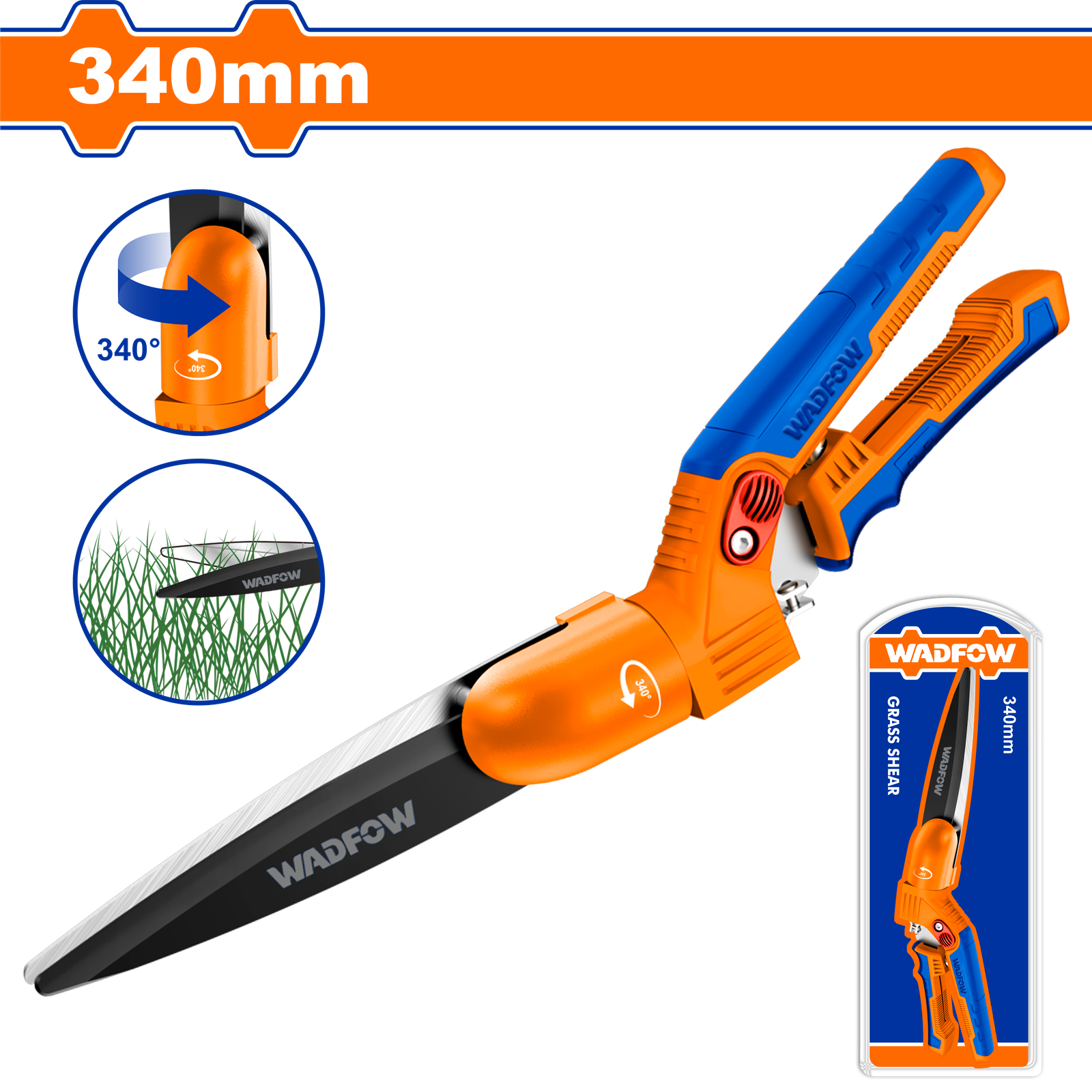 | 340° grass shear Size:/340mm Blade size:7″/180mm Net weight:315g Heat treatment w/non stick coating ABS handle with TPR grip Packed by sliding card |