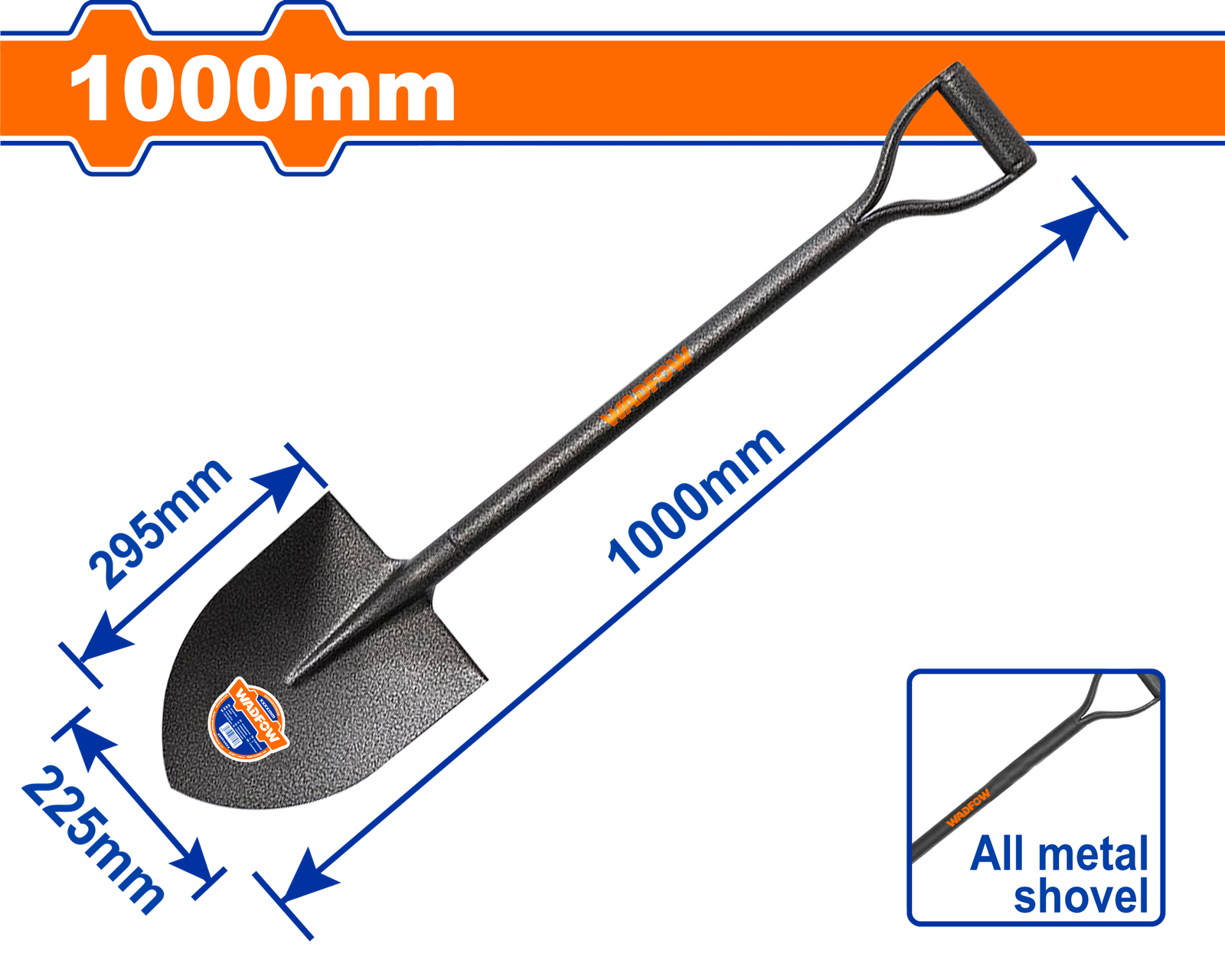 | All metal shovel Length: 1000mm Shovel weight: 1.4kg Shovel head weight: 0.7kg Blade type: round point With D-shaped handle Shovel head width: 225mm Shovel head length: 295mm Material: carbon steel Packed by label |