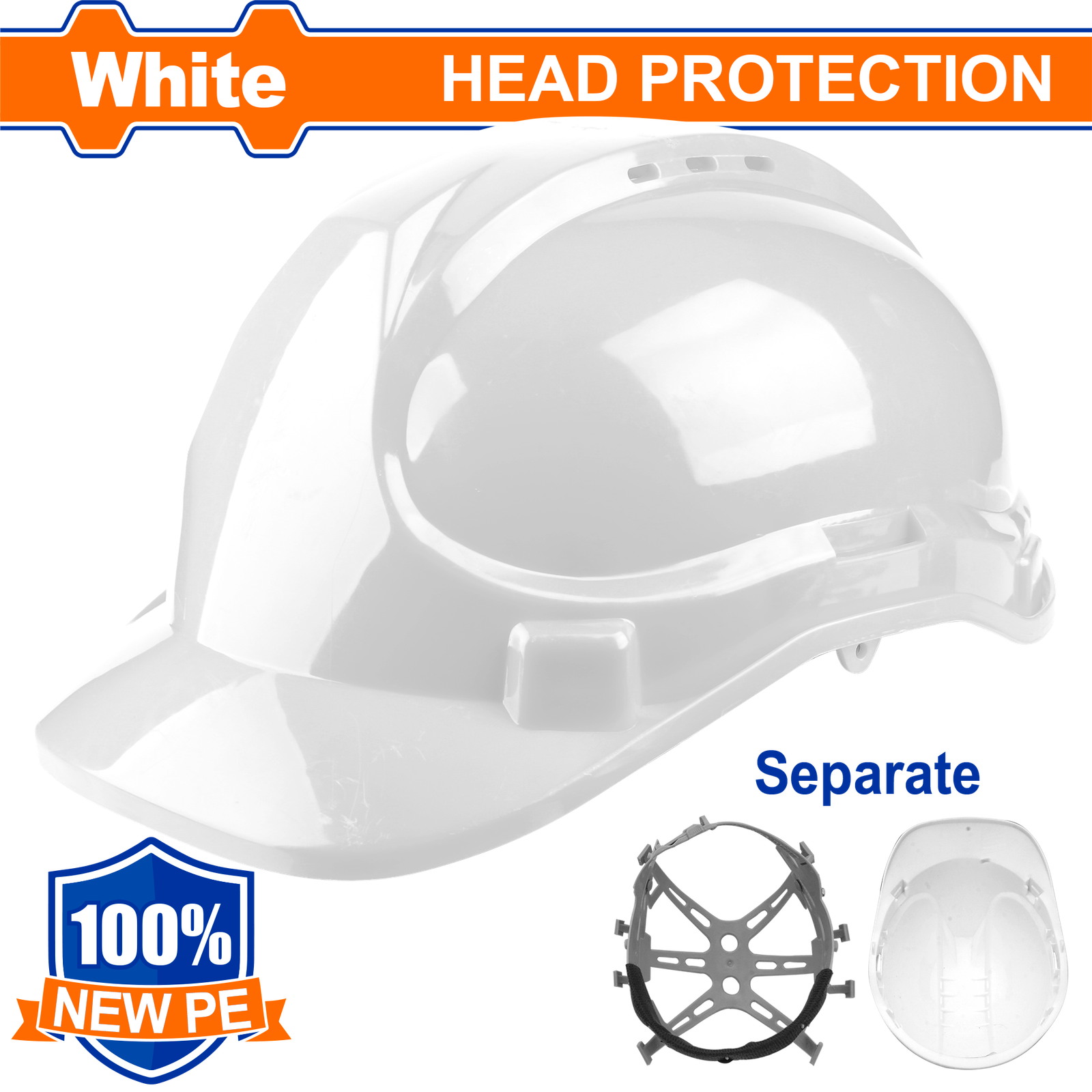 | Head protection PE shell Lining material: plastic Chin strap included Color:white Weight:320g 6 Point suspension Adjust head size by buckle packed by label |