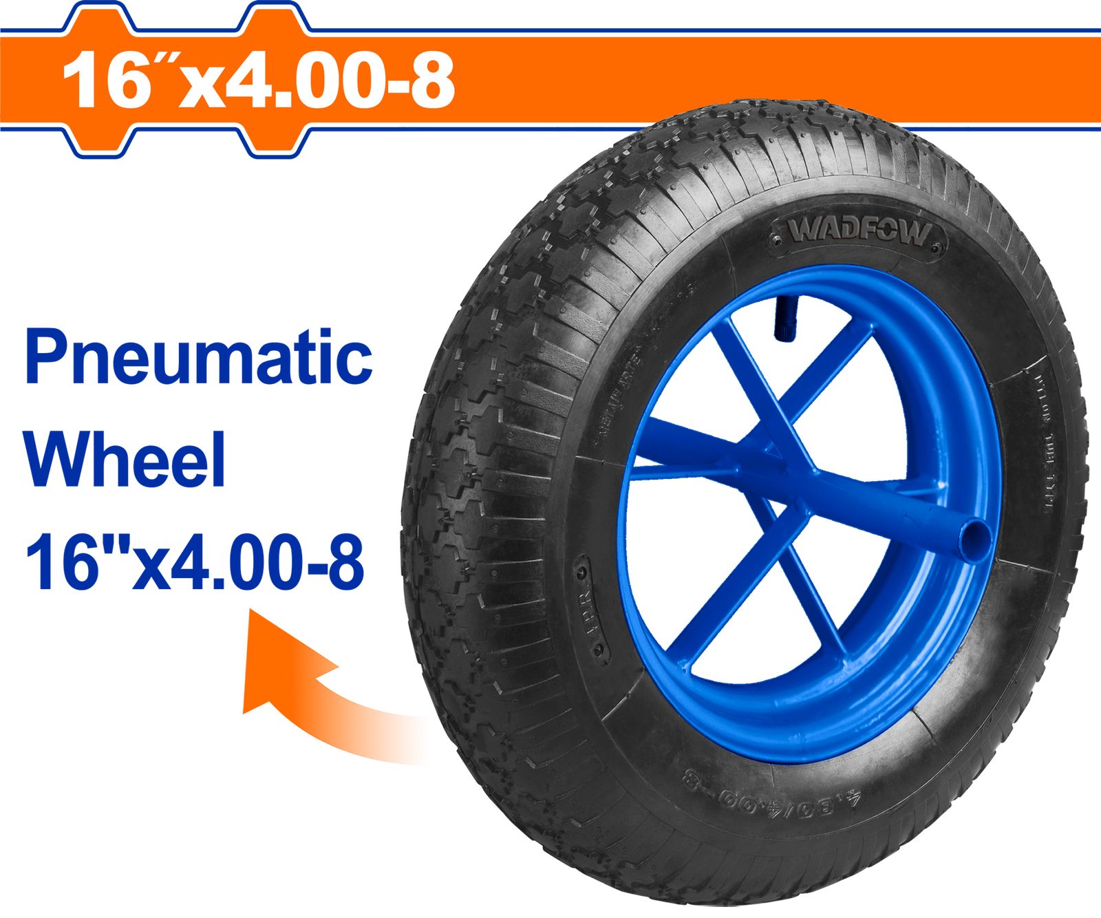 | MAX Load (kg):130 Wheel:16″X4.00-8,pneumatic wheel,4PR Tyre with diamond lines. Suitable for item WWB1F01 , WWB1F02 Packed by label |